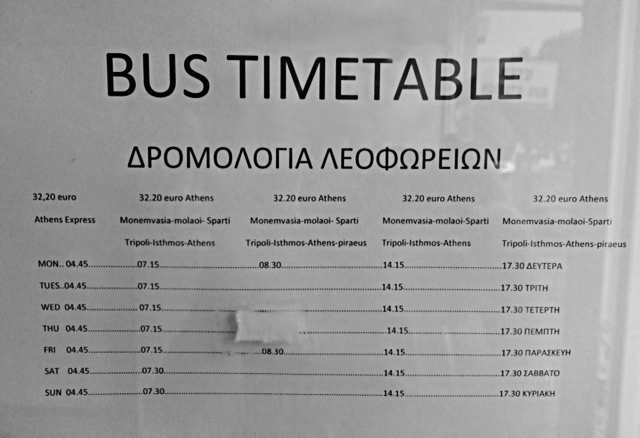 (Athens - Isthmos - Tripoli - Sparti - Skala - Molaoi - Monemvasia: i.R. ca. 5 Stunden Monemv. bis Isthmos), ca. € 32,50.
